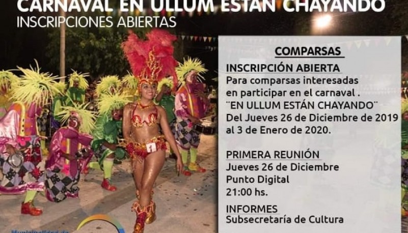 El intendente Leopoldo Soler y la Subsecretaría de Cultura, informan que están abiertas las inscripciones para las comparasas que quieran participar en el carnaval. A partir del 26 de diceimbre hasta el 3 de enero podrán inscribirse por, y este jueves en el Punto Digital del departamento será la primera reunión informativa, a las 21.  El carnaval será el 31  de enero y 1 de febrero del 2020.