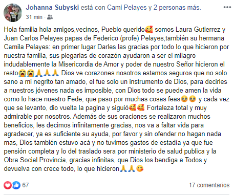 La familia del querido docente sarmientino comunicó a través de la red social Facebook sobre el estado de salud y su pronto regreso. Además agradecieron por las oraciones y ayuda recibida. El traslado estará a cargo del Ministerio de Salud Pública y la Obra Social Provincia.  Con este posteo agradecieron sus padres:  Hola familia hola amigos,vecinos, Pueblo querido???? somos Laura Gutierrez y Juan Carlos Pelayes papas de Federico (profe) Pelayes,también su hermana Camila Pelayes: en primer lugar Darles las gracias por todo lo que hicieron por nuestra familia, sus plegarias de corazón ayudaron a ser el milagro indudablemente la Misericordia de Amor y poder de nuestro Señor hicieron el resto???????????????????? Dios ve corazones nosotros estamos seguros que no solo sano a mi negrito tan amado, el fue solo un instrumento de Dios, para decirles a nuestros jóvenes nada es imposible, con Dios todo se puede amen la vida como lo hace nuestro Fede, que paso por muchas cosas feas???????? y cada vez que se levanto, dio vuelta la pagina y siguió???????? Fortaleza total y muy admirable por nosotros. Además de sus oraciones se realizaron muchos beneficios, les decimos infinitamente gracias, nos va a faltar vida para agradecer, ya es suficiente su ayuda, por favor y sin ofender no hagan nada mas, Dios también estuvo acá y no tuvimos gastos de estadía ya que fue pensión completa y lo del traslado sera por ministerio de salud publica y la Obra Social Provincia, gracias infinitas, que Dios los bendiga a Todos y devuelva con crece todo, lo que hicieron????????????